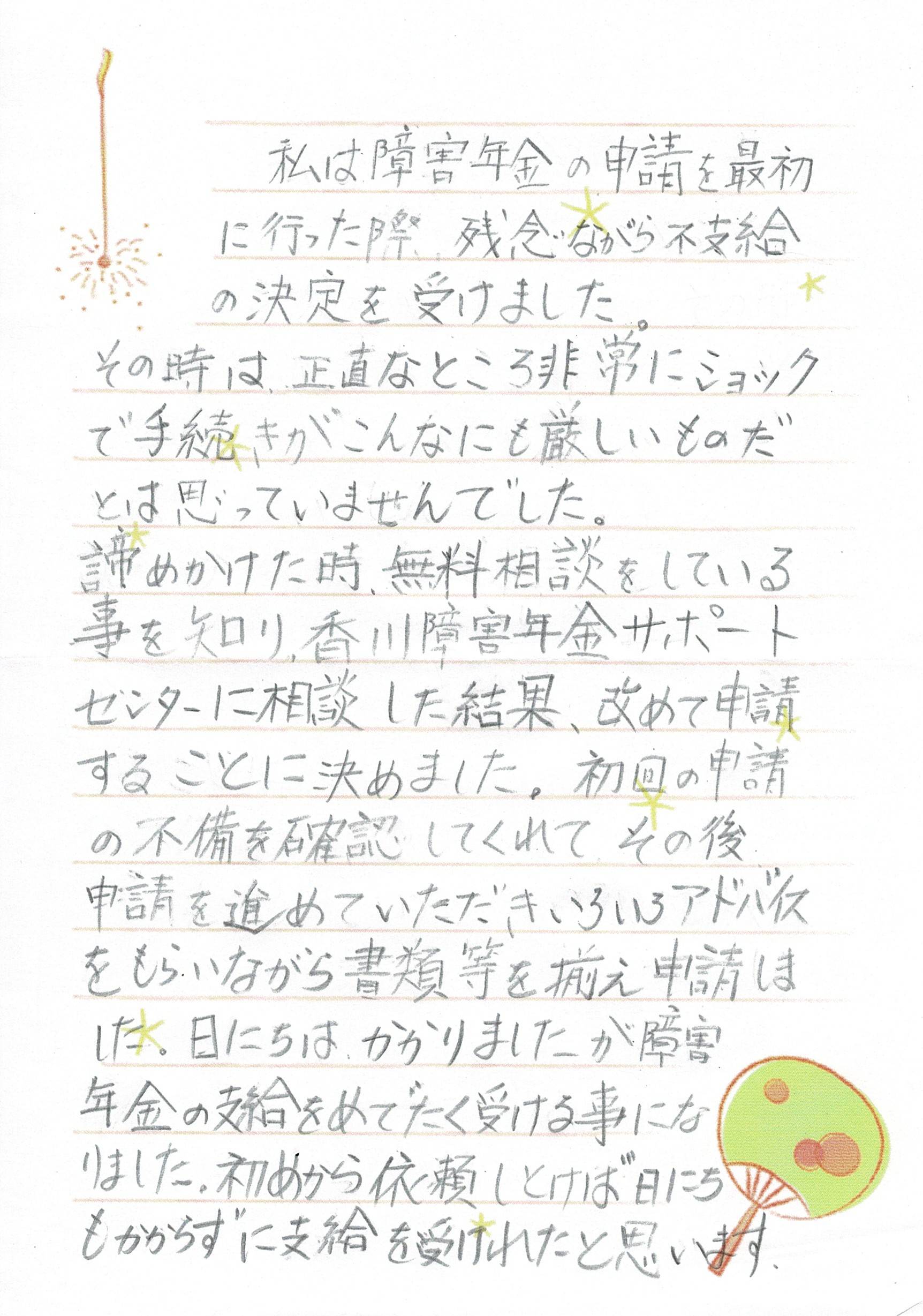 諦めかけた時、無料相談をしている事を知り、香川障害年金サポートセンターに相談した結果、改めて申請することに決めました。初回の申請の不備を確認してくれて、その後、申請を進めていただきいろいろアドバイスをもらいながら書類等を揃え申請しました。日にちはかかりましたが障害年金の支給をめでたく受ける事になりました。初めから依頼しとけば日にちもかからずに支給を受けれたと思います。
